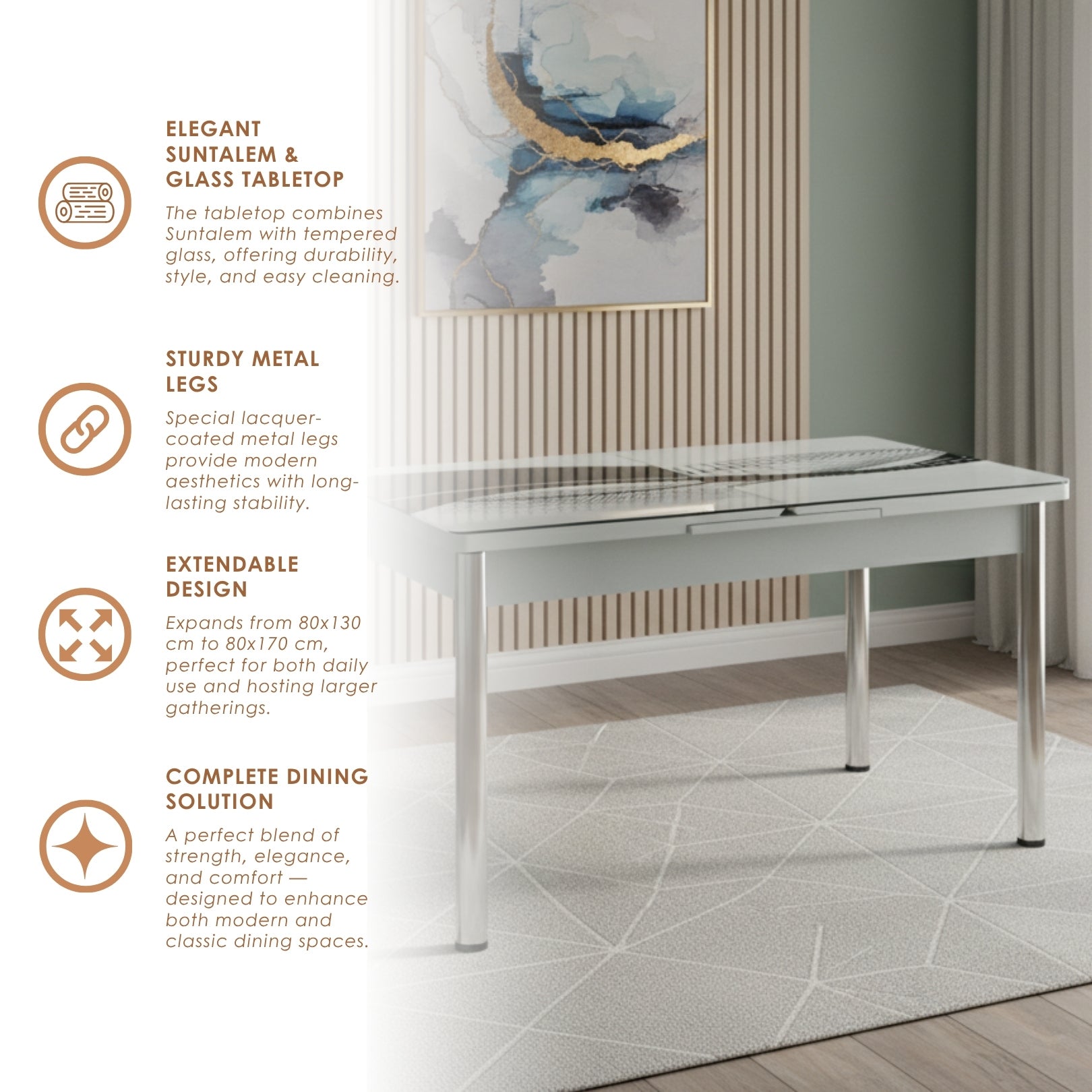 The extendable dining table features a Suntalem surface with a tempered glass top, offering a sleek, stylish, and easy-to-clean design. Its lacquer-coated metal legs not only add elegance but also provide strong support. The table extends from 80x130 cm to 80x170 cm, giving you the flexibility to adapt to both everyday use and larger gatherings. The oval-shaped edges ensure added safety, especially in homes with children.
