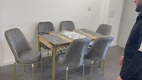 Gray Extendable Dining Table with Tempered Glass Top & Metal Legs +6 Upholstered Chairs
