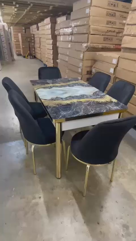 Black Extendable Dining Table with Tempered Glass Top & Metal Legs +6 Upholstered Chairs
